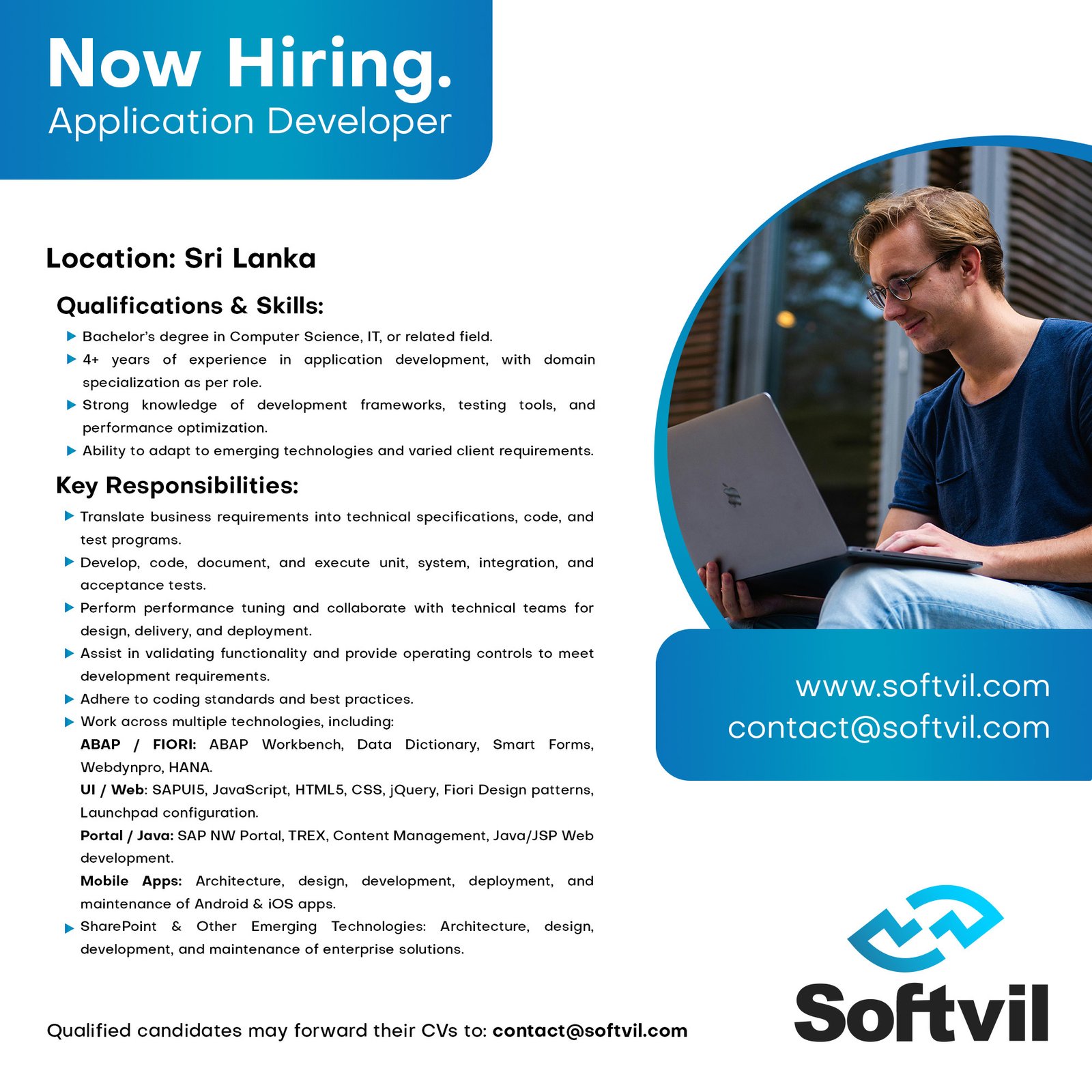 Application DeveloperStandard Job DescriptionTransform business function requirements into technical program specs to code, test and debug programs.Develop, code, document and execute unit tests, systems, integration and acceptance tests and testing tools for functions of high complexityPerform performance tuning to improve performance over multiple functions & Engage other technical team members in the design, delivery, and deployment of solutions.Assist in testing to validate and provide operating controls to ensure development requirements are satisfiedAdhere to the CLIENT coding standards.Experience and QualificationBachelor’s Degree Computers, technology or any other related discipline. Relevant Certifications.Solution Expert who has varied experience of at least 4 years and is specialized in the concerned domainThe types of developer would be one of the belowABAP / FIORI – Proficiency in ABAP Technologies – ABAP Workbench, ABAP Data Dictionary, Report Programming, Screen Programming, Smart forms, Adobe forms, Performance Tuning, Webdynpro ABAP. Experience of working with ABAP for HANA.Experience working with the languages (e.g. SAPUI5, JavaScript, CSS, HTML5, jQuery), SAP Web IDEExperience in Fiori Design patterns, expertise in UI Theme designer & FIORI – GATEWAY ServicesStrong understanding of the UI principles & Experience in Fiori Launchpad configurationPortal- Experience with SAP NW Portal 7.01/7.31/7.4/7.5. Experience in implementing SAPPortal solutions for KM (Knowledge Management) with TREX configurations, Content Management, SSL configurations, designing and Developing UI components based on WebDynpro Java / PDK framework. Experience in SAP Portal Java / JSP Web Development with good programming skills in DHTML, Java/JSP, XML, JavaScript, SQL queries on Oracle & MS SQL Database servers. Experience in developing responsive websites with HTML5 CSS3 JavaScript / JQuery technologies.