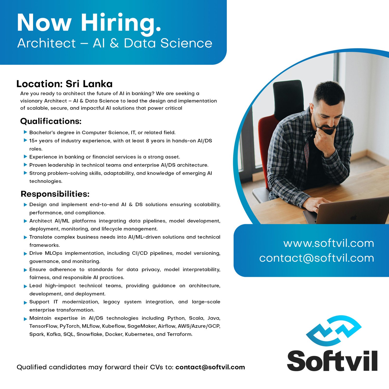 Architect – AI & Data ScienceAre you ready to architect the future of AI in banking? We are seeking a visionary Architect – AI & Data Science to lead the design and implementation of scalable, secure, and impactful AI solutions that power critical innovations in the financial services sector.This is a strategic role, ideal for someone who combines deep technical expertise with strong leadership and enterprise architecture experience.Key ResponsibilitiesDesign and implement end-to-end AI & DS solutions, ensuring scalability, performance, and compliance.Architect and oversee AI/ML platforms integrating data pipelines, model development, deployment,monitoring, and lifecycle management.Translate complex business needs into AI/ML-driven solutions and technical frameworks.Drive MLOps implementation including CI/CD pipelines for models, versioning, governance, and monitoring.Work closely with data engineers, ML teams, and key stakeholders to align AI initiatives with broader enterprise goals.Ensure adherence to standards around data privacy, model interpretability, fairness, and responsible AI practices.QualificationsBachelor’s degree in Computer Science,Information Technology, or a related field.15+ years of industry experience, including at least 8 years in hands-on AI/DS roles.Prior experience in roles such as AI & DS Architect, Senior Tech Lead – AI & DS, or equivalent leadership positions.Experience in banking or financial services is a strong asset.Background in IT modernization, legacy system integration, and large-scale enterprise transformation.Strong proficiency in Python, Scala, Java, with hands-on experience in TensorFlow, PyTorch, Scikit-learn, MLflow, Kubeflow, SageMaker, Airflow, AWS, Azure, GCP, Spark, Kafka, SQL, Snowflake,Docker, Kubernetes, Terraform, and governance tools such as model cards, XAI tools, and diƯerential privacy.High attention to detail and problem-solving mindsetAdaptable, curious, and eager to explore emerging AI technologiesComfortable working both independently and within collaborative, agile teamsAlignment with ComBank’s IT culture and strategic visionProven experience in leading high-impact technical teamsStrong project management capabilities including task estimation and stakeholder coordinationExcellent communication skills to serve as a liaison between business and technical teams