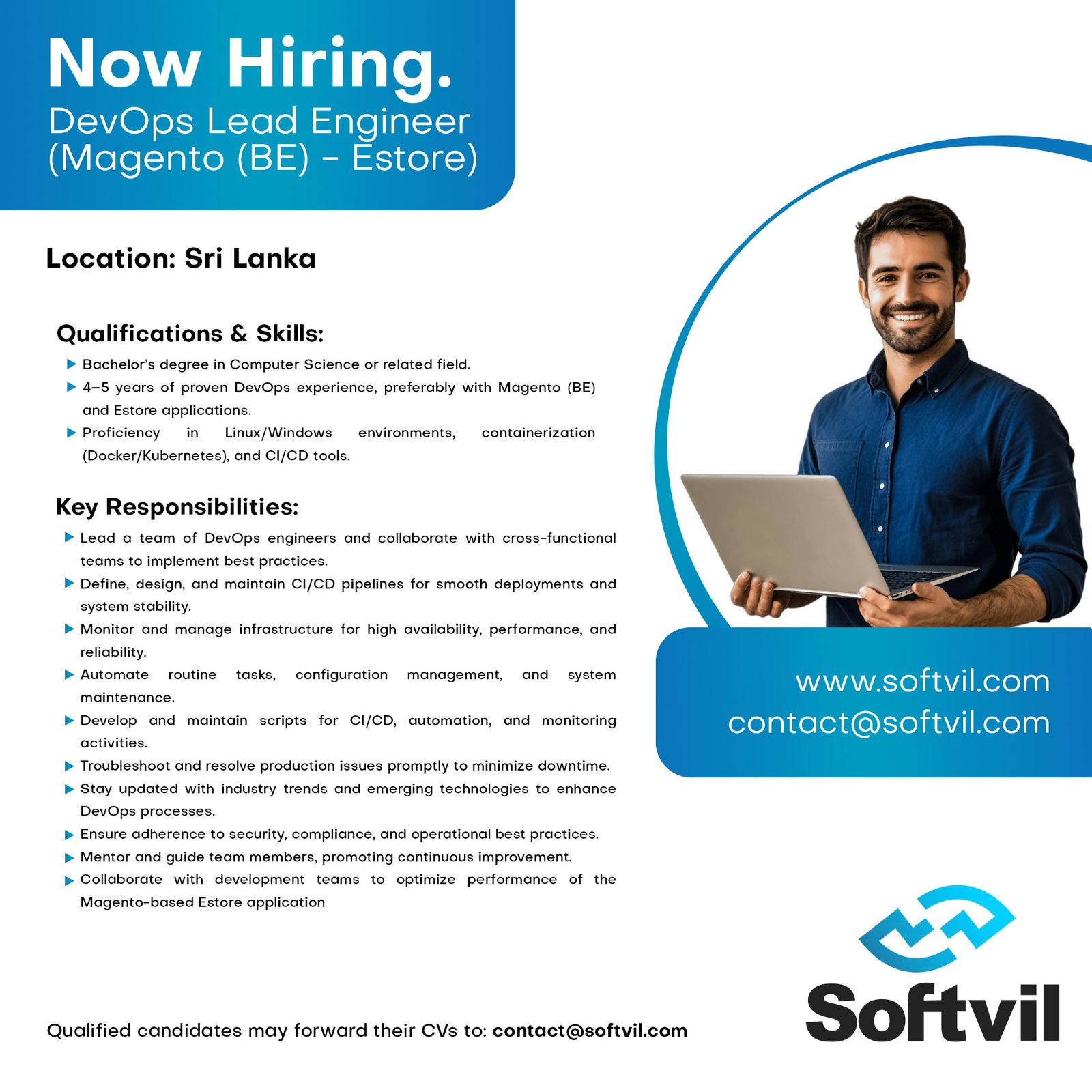 DevOps Lead Engineer – Magento (BE) – EstoreJob Title: DevOps Lead Engineer- L3 – Magento (BE) – EstoreExperience: 4-5 YearsJob Type: On-SiteLocation: Colombo, Sri LankaJob Description:We are seeking a dynamic and experienced DevOps Lead Engineer with a strong focus on Magento (BE) and Estore to lead and manage our DevOps efforts for the Estore application. If you have a passion for DevOps and are eager to take a leadership role, this position offers an exciting opportunity.Key Responsibilities:Lead a team of DevOps Engineers and collaborate with cross-functional teams to define, design, and implement DevOps best practices for the Magento-based Estore application.Establish and maintain a robust CI/CD pipeline, ensuring smooth deployment processes.Oversee the management and monitoring of infrastructure to ensure high availability and performance.Automate routine tasks, manage configuration, and ensure system stability.Develop and maintain scripts for CI/CD, system automation, and monitoring.Troubleshoot and resolve production issues promptly to minimize downtime.Stay updated with industry trends and emerging technologies to optimize the performance of the Estore application.Qualifications:Bachelor’s degree in Computer Science or a related field.Proven experience (4 to 5 years) as a DevOps Engineer.Strong expertise in Magento (BE) and Estore application development.Proficiency in Linux and Windows environments.Experience with containerization (Docker/Kubernetes).Extensive knowledge of CI/CD tools and processes.Scripting skills (e.g., Bash, Python, or similar).