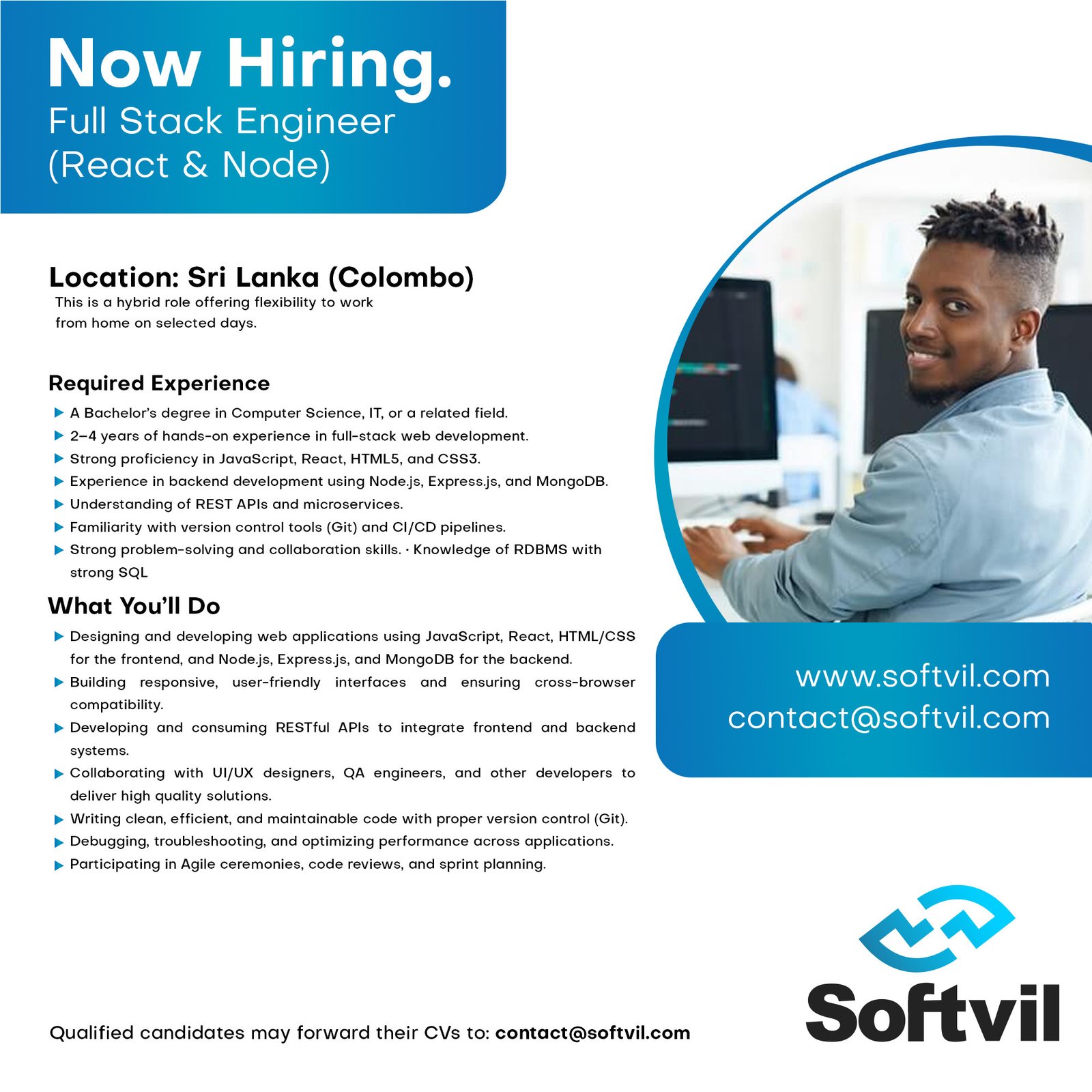 Full stack Engineer (React & Node)We are looking for a passionate and experienced Senior Full Stack Engineer (React & Node.js) to join our dynamic team in Colombo, Sri Lanka. This is a hybrid role offering flexibility to work from home on selected days.As a Senior Full Stack Engineer, you will be responsible for designing, developing, and maintaining scalable web applications across both the front-end and back-end. You will collaborate with cross-functional teams including UI/UX designers, product managers, and QA engineers to deliver high-quality software solutions aligned with client requirements. The Solution Developer will be responsible for:– Designing and developing web applications using JavaScript, React, HTML/CSS for the frontend, and Node.js, Express.js, and MongoDB for the backend.– Building responsive, user-friendly interfaces and ensuring cross-browser compatibility.– Developing and consuming RESTful APIs to integrate frontend and backend systems.– Collaborating with UI/UX designers, QA engineers, and other developers to deliver high-quality solutions.– Writing clean, efficient, and maintainable code with proper version control (Git).– Debugging, troubleshooting, and optimizing performance across applications.– Participating in Agile ceremonies, code reviews, and sprint planning.The ideal candidate should possess:– A Bachelor’s degree in Computer Science, IT, or a related field.– 2–4 years of hands-on experience in full-stack web development.– Strong proficiency in JavaScript, React, HTML5, and CSS3.– Experience in backend development using Node.js, Express.js, and MongoDB.– Understanding of REST APIs and microservices.– Familiarity with version control tools (Git) and CI/CD pipelines.– Strong problem-solving and collaboration skills. • Knowledge of RDBMS with strong SQL skills and schema design.What We Offer– Competitive salary based on experience and performance.– Flexible hybrid working arrangement.– A collaborative and inclusive work culture.– Opportunities to work on international projects and clients.– Career growth through continuous learning and mentorship