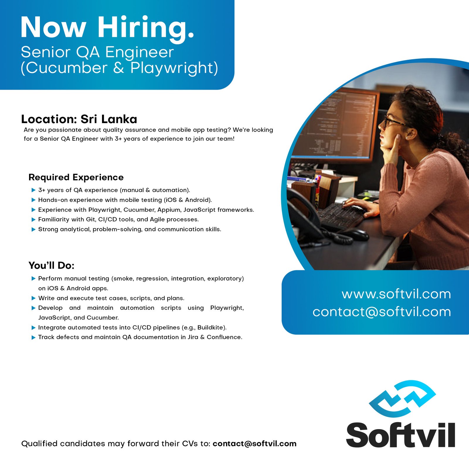 Senior QA Engineer (Cucumber & Playwright)Are you passionate about quality assurance and mobile app testing? We’re looking for a Senior QA Engineer with 3+ years of experience to join our team!What You’ll Do:– Perform manual testing (smoke, regression, integration, exploratory) on iOS & Android apps.– Write and execute test cases, scripts, and plans.– Develop and maintain automation scripts using Playwright, JavaScript, and Cucumber.– Integrate automated tests into CI/CD pipelines (e.g., Buildkite).– Track defects and maintain QA documentation in Jira & Confluence.What We’re Looking For:– 3+ years of QA experience (manual & automation).– Hands-on experience with mobile testing (iOS & Android).– Experience with Playwright, Cucumber, Appium, JavaScript frameworks.– Familiarity with Git, CI/CD tools, and Agile processes.– Strong analytical, problem-solving, and communication skills.