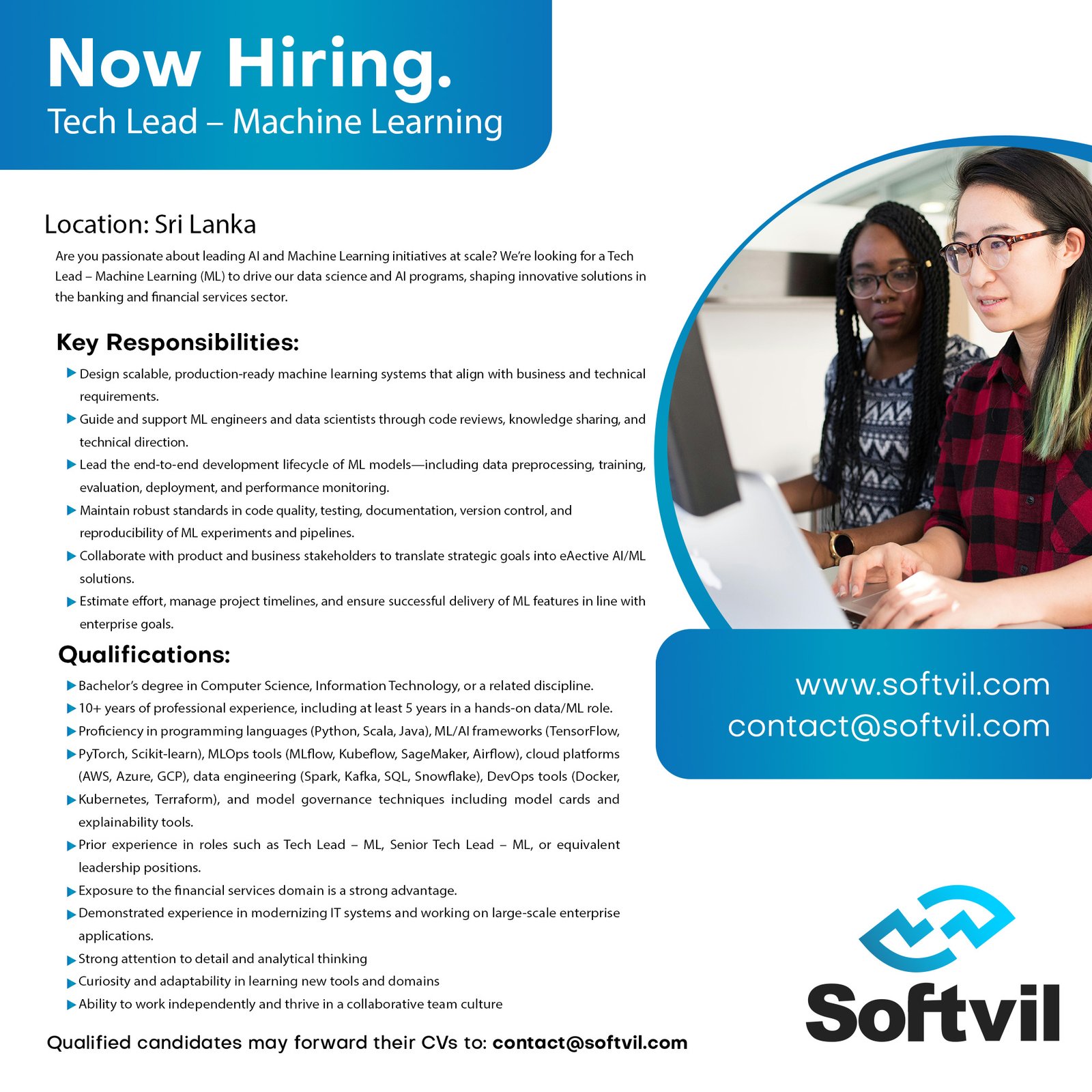 Tech Lead – Machine Learning (Fixed Term Contract)Are you passionate about leading AI and Machine Learning initiatives at scale? We’re looking for a Tech Lead – Machine Learning (ML) to drive our data science and AI programs, shaping innovative solutions in the banking and financial services sector.As part of our advanced technology team, you’ll lead the design and deployment of scalable ML systems, mentor a team of ML engineers and data scientists, and ensure the highest engineering standards across projects.Key ResponsibilitiesDesign scalable, production-ready machine learning systems that align with business and technical requirements.Guide and support ML engineers and data scientists through code reviews, knowledge sharing, and technical direction.Lead the end-to-end development lifecycle of ML models—including data preprocessing, training, evaluation, deployment, and performance monitoring.Maintain robust standards in code quality, testing, documentation, version control, and reproducibility of ML experiments and pipelines.Collaborate with product and business stakeholders to translate strategic goals into eƯective AI/ML solutions.Estimate eƯort, manage project timelines, and ensure successful delivery of ML features in line with enterprise goals.QualificationsBachelor’s degree in Computer Science, Information Technology, or a related discipline.10+ years of professional experience, including at least 5 years in a hands-on data/ML role.Proficiency in programming languages (Python, Scala, Java), ML/AI frameworks (TensorFlow, PyTorch, Scikit-learn), MLOps tools (MLflow, Kubeflow, SageMaker, Airflow), cloud platforms (AWS, Azure, GCP), data engineering (Spark, Kafka, SQL, Snowflake), DevOps tools (Docker, Kubernetes, Terraform), and model governance techniques including model cards and explainability tools.Prior experience in roles such as Tech Lead – ML, Senior Tech Lead – ML, or equivalent leadership positions.Exposure to the financial services domain is a strong advantage.Demonstrated experience in modernizing IT systems and working on large-scale enterprise applications.Strong attention to detail and analytical thinkingCuriosity and adaptability in learning new tools and domainsAbility to work independently and thrive in a collaborative team cultureAlignment with ComBank’s organizational values and technology cultureProven ability to mentor and lead diverse technical teamsProject management skills including task estimation, timeline planning, and stakeholder communicationEƯective in translating complex technical concepts into actionable business solutions